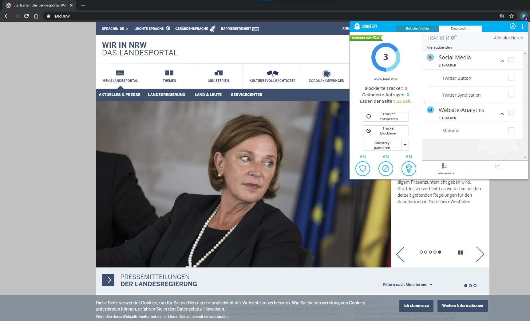 Nur kurzer Besuch um sich über Neuigkeiten auf der Seite https://land.nrw zu informieren brachte in Sachen Datenschutz eine klare Ernüchterung.